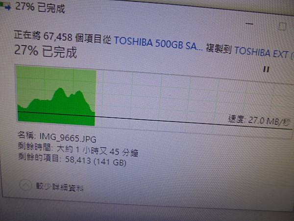 【救出檔案】TOSHIBA東芝500GB~7200轉3.5吋裸碟是公司進銷存電腦使用→正常使用時突然自動關機~重新開機後C槽D槽消失/未初始化磁碟→要救回進銷存檔案資料~正在將67458個項目複製到TOSHIBA EXT(G:)→新北市鶯歌區-潘先生【27%已完成】