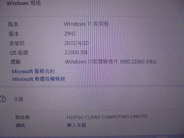 【超級輕薄】FUJITSU富士通LIFEBOOK 9U13A2~UH-X筆記型電腦878g重量→公司兩位業務需求超級輕薄筆電~長時間在外或下班時帶回最輕便~或需與外國客戶聯繫~版本Windows 11家用版 安裝於2022/4/20→新北市新莊區-陳先生【OS組建22000.318】