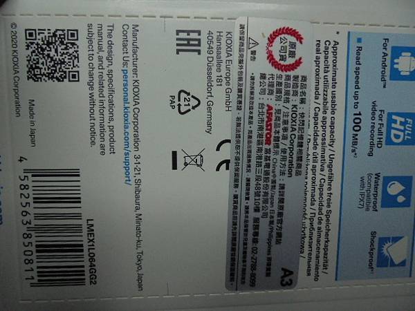 【損壞率低】KIOXIA鎧俠Micro SDXC記憶卡64GB~家裏的小米攝影機需求使用→多年前送來救援無法讀取的隨身碟救援與iPhone手機~相信並購買我推薦的儲存裝置→KIOXIA鎧俠記憶卡吊卡包裝背面貼有代理商貼紙~新北市土城區-吳小姐【富基電通】