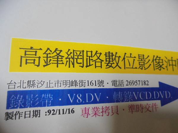 【再次送來】民國86年3月31日拍攝迎娶與婚宴的錄影帶~已於民國92年11月16日委由其他業者→轉為MPEGAV視訊檔案燒錄為VIDEO CD~要轉為MP4影片檔案上傳雲端→光碟片保存盒的標示~新北市中和區-吳小姐【製作日期92/11/16光碟片錄製86/03/31】 【再次送來】民國86年3月31日拍攝迎娶與婚宴的錄影帶~已於民國92年11月16日委由其他業者→轉為MPEGAV視訊檔案燒錄為VIDEO CD~要轉為MP4影片檔案上傳雲端→光碟片保存盒的標示~新北市中和區-吳小姐【製作日期92/11/16光碟片錄製86/03/31】