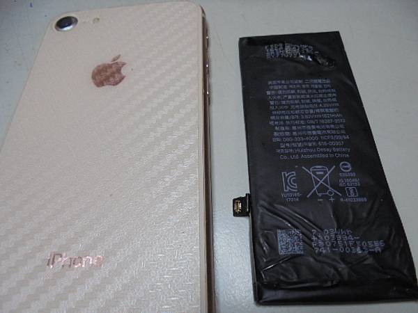 【耗電快速】Apple蘋果iPhone 8 MQ6J2TA/A~64GB智慧型手機→使用多年後原廠電池耗電快速~很快充飽100%電量→卻突然自行斷電關機~已更換相同的認證電池→損壞拆出的原廠電池背面~新北市板橋區-高小姐【Apple蘋果iPhone 8智慧型手機背面】