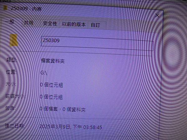 【留件轉檔】民國86年3月31日拍攝迎娶與婚宴的錄影帶~已於民國92年11月16日委由其他業者→轉為MPEGAV視訊檔案燒錄為VIDEO CD~已轉為MP4影片檔案上傳雲端→於新增磁碟機(G:)新增檔案資料夾250309~新北市中和區-吳小姐【檔案資料夾是空的】