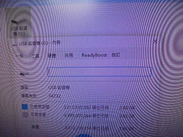 【救出檔案】Transcend創見JetFlash V10→8GB隨身碟先插在公司電腦儲存檔案後~帶回家插進筆記型電腦讀取→卻找不到先前儲存的檔案~已救回重要的Word檔案→USB磁碟機(G:)可用空間4.65GB大小總計7.46GB~新北市永和區-李小姐【已使用2.8GB】