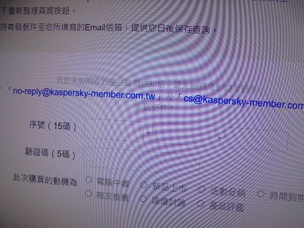 【即將到期】Kaspersky卡巴斯基antivirus software防毒軟體→二年前到府安裝於店裏最主要的工作電腦使用~近日彈出視窗通知即將到期→要繼續使用Kaspersky~轉進輸入視窗 序號(15碼)驗證碼(5碼)→臺北市環河南路-劉小姐【此次購買的動機為】